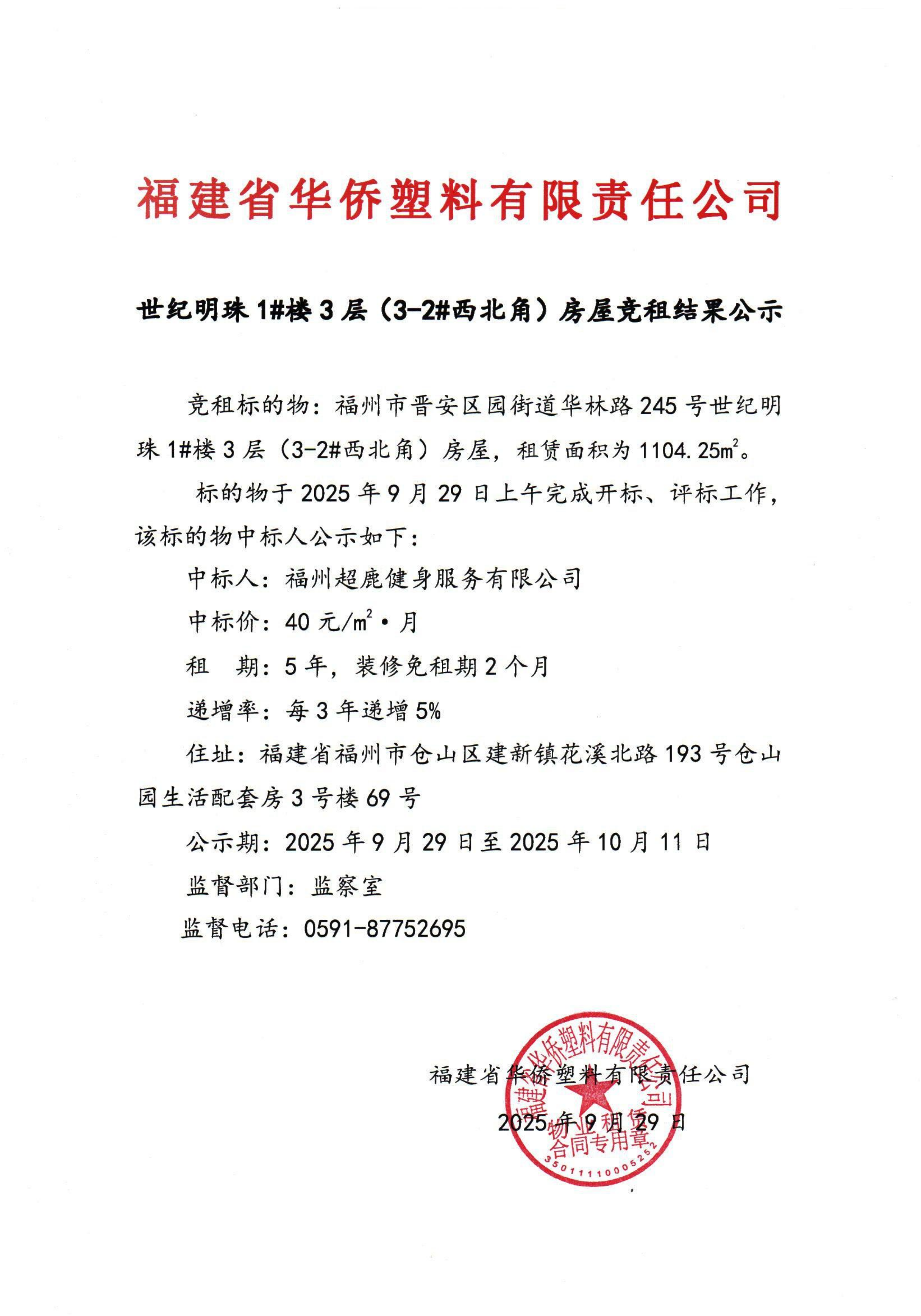 世紀明珠1#樓3層(3-2#西北角)房屋競租結果公示